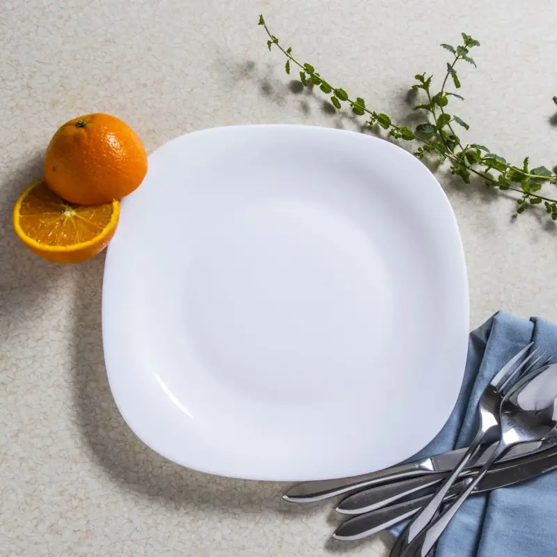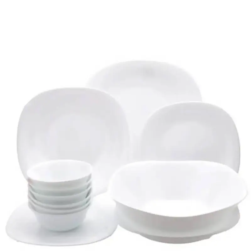 - Bộ chén đĩa 12 món hình vuông (vê cạnh) chất liệu gốm thủy tinh opal glass, được gia nhiệt nhằm hoàn thiện chức năng và tăng cường độ bền, mang lại khả năng chịu nhiệt và chịu va đập cao gấp 3 lần các sản phẩm thủy tinh thông thường. Thích hợp để bày các món với khẩu phần nhỏ.