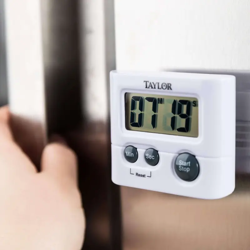 - Nam châm tích hợp: đồng hồ hẹn giờ nấu ăn Taylor có thể tự đứng trên mặt quầy hoặc treo trên kệ hoặc thiết bị có nam châm tích hợp.