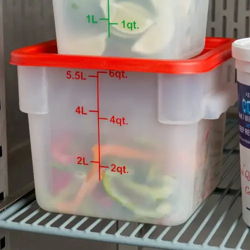 - Vạch chia mức dung tích màu đỏ đậm được in ở mặt bên của hộp cho phép bạn dễ dàng đo lường ngay lập tức thực phẩm dạng lỏng. Để sử dụng thuận tiện, các vạch đo được in cả đơn vị (quart) và đơn vị (lít).